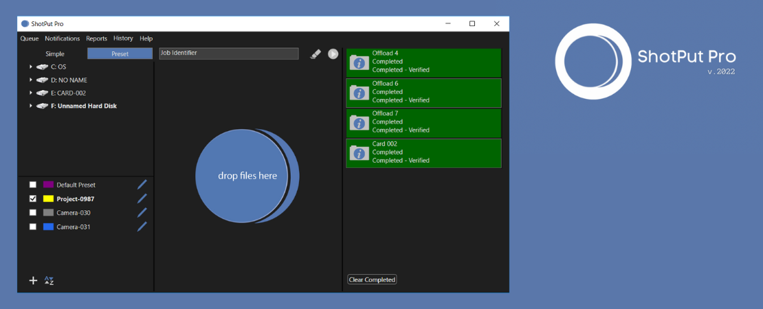 ShotPut Pro™ pour Mac et Windows est un logiciel d'automatisation de copie/gestion des rushes vidéo, audio et photo. Son interface utilisateur simple et ses vitesses de copie élevées en font un outil indispensable.